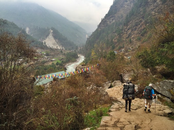 Today’s trail takes us up and down, gaining and losing elevation all the way to Namche Bazaar. Our guide instructs us at the beginning of the day that the route will be “Nepali flat,” my dad nods agreeably but I warn him of what I learned on the Annapurna Circuit – nothing in Nepal is truly flat, especially in the Himalayas. Dad would call these sections “substantial and steep.”