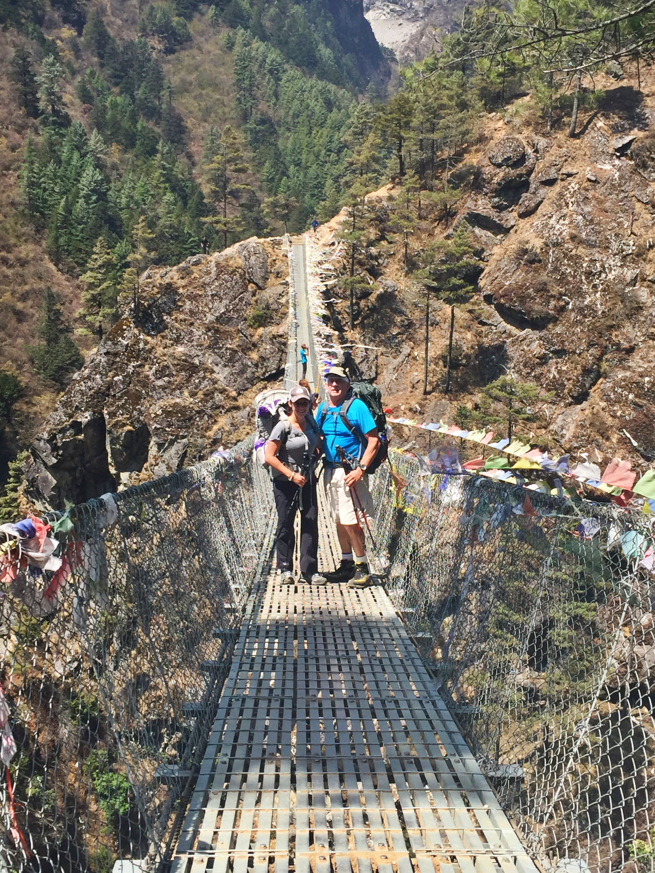 A huge, long suspension bridge overlooking a thousand feet of thin mountain air marks the beginning of our steep ascent to Namche. We move slowly on a dirt trail through a forest that strangely feels like home in the Northwest. This comparison is quickly nullified when through the trees, at a distance, we see our first view of Mt. Everest.