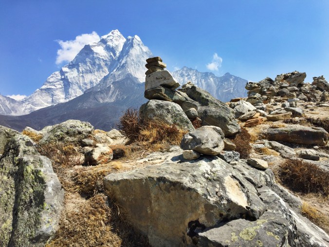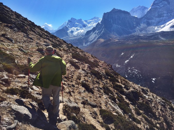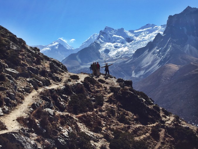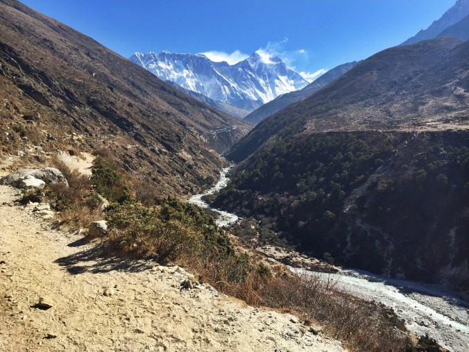 We set off at 7 and follow a trail that hugs the cliffside for a few hours in the hot morning sun. We’re walking towards Everest, waving at us from just a week’s walk away.