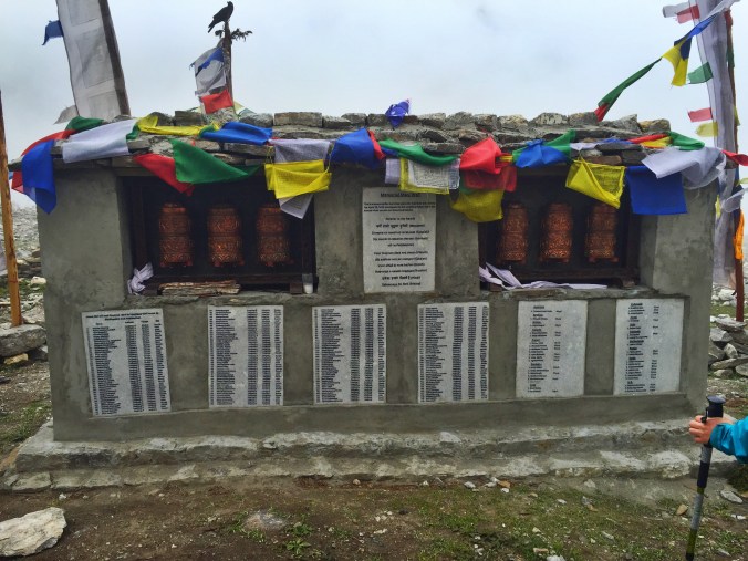On my way up, I had passed through an area enclosed by circles of prayer flags around what I originally saw as a stack of prayer stones, the same ones that guided our way up. Returning through, Joannie shows me that this is actually a memorial monument with inscriptions of the name of all the people who lost their lives in the valley from last year’s earthquake. There are hundreds of Nepali names, and two entire stones dedicated to the names of visiting foreigners. It is a beautiful and sombering stone.