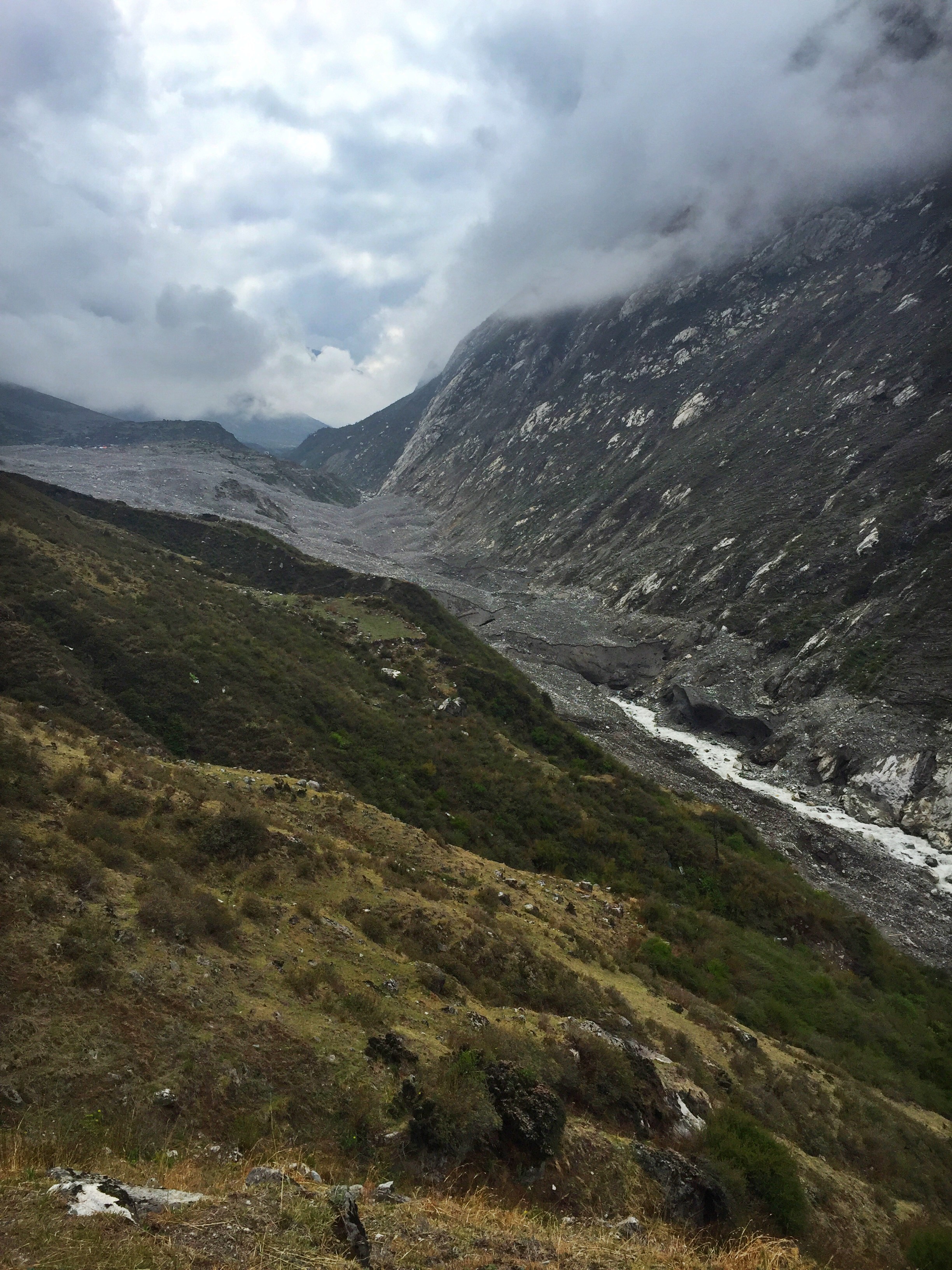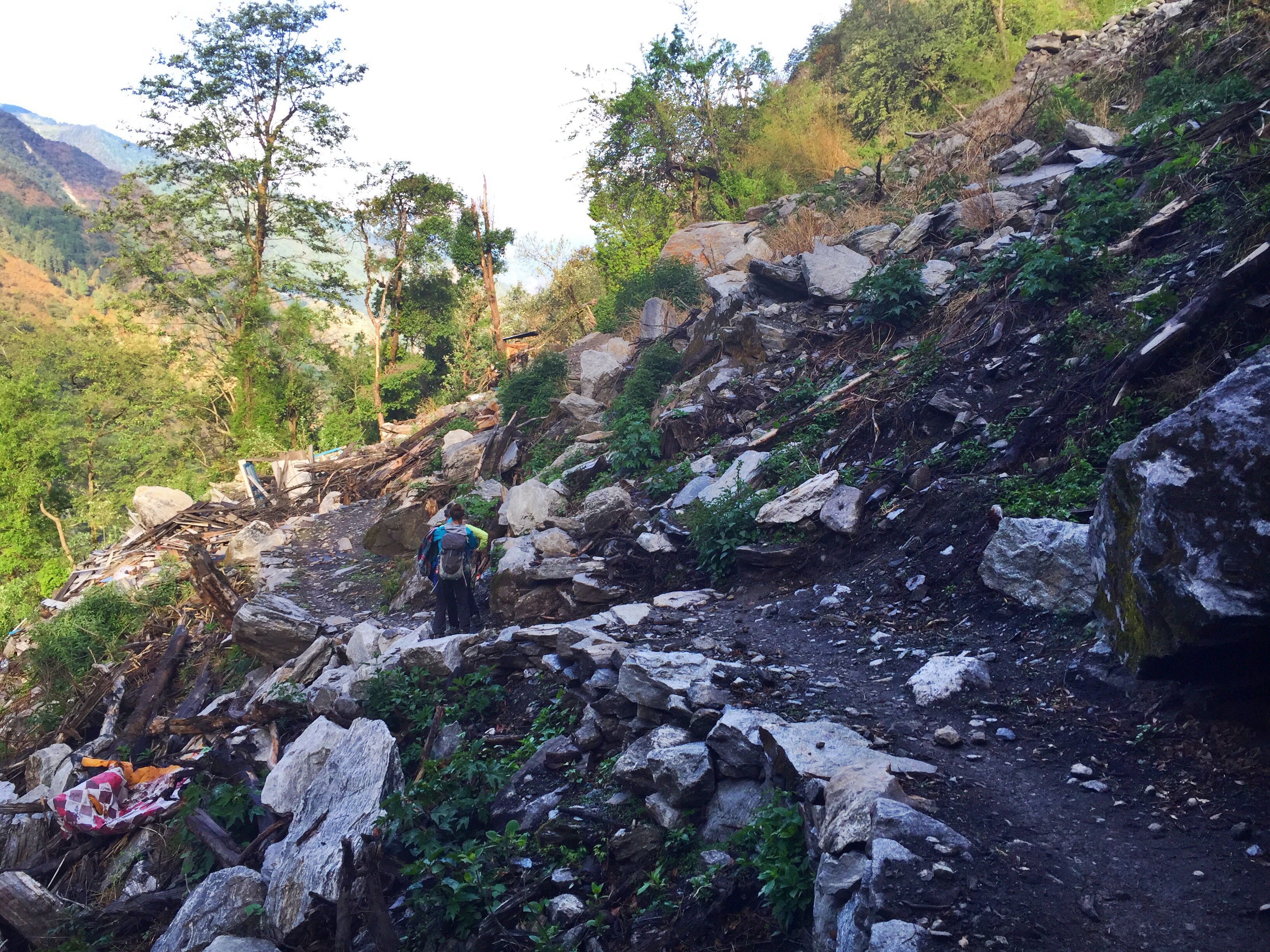 It’s already warm out by the time we start our descent at 7am. Light fills the valley and the blazing sun follows us all morning as we wind through rocky moraines and through landslides from the earthquake and its aftershocks. There have been more than 400 aftershocks since Nepal’s April 2015 earthquake.