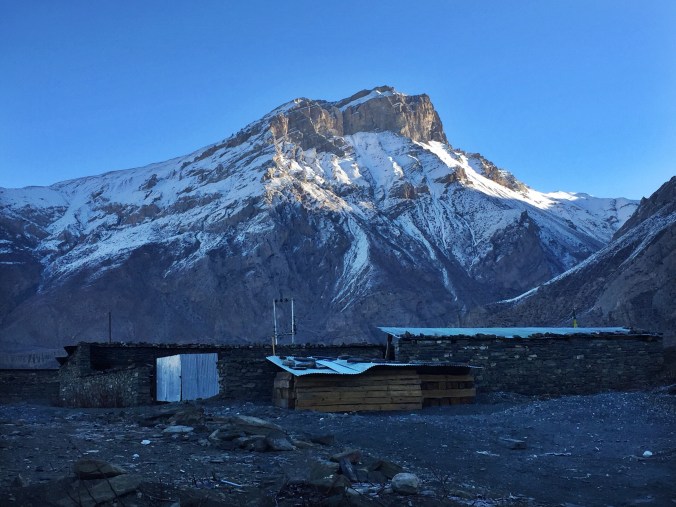 Our five hour walk today is dry, dusty, and a monotonous flat. We arrive in Jomsom hot and thirsty from long and relentlessly windy day. Jomsom is actually a very large town, stretching two kilometers and hosting a popular airport. Except, the airport is also unpopular enough where we are warned by multiple guides and lodge owners to avoid these flights because of unpredictable mountain weather and a less-than-squeaky-clean resume of airplane crashes.